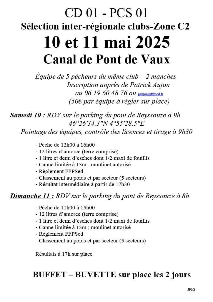 Sélection inter-régionale des clubs de la zone C2 par équipe de 5 pêcheurs du même club. Manifestation organisée par le CD01 et le PCS01
