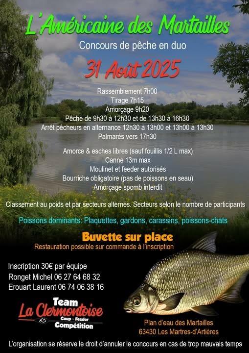 Concours open en américaine organisé par le team La Clermontoise sur le plan d'eau des Martailles situé aux Martres-d'artières 63430.
