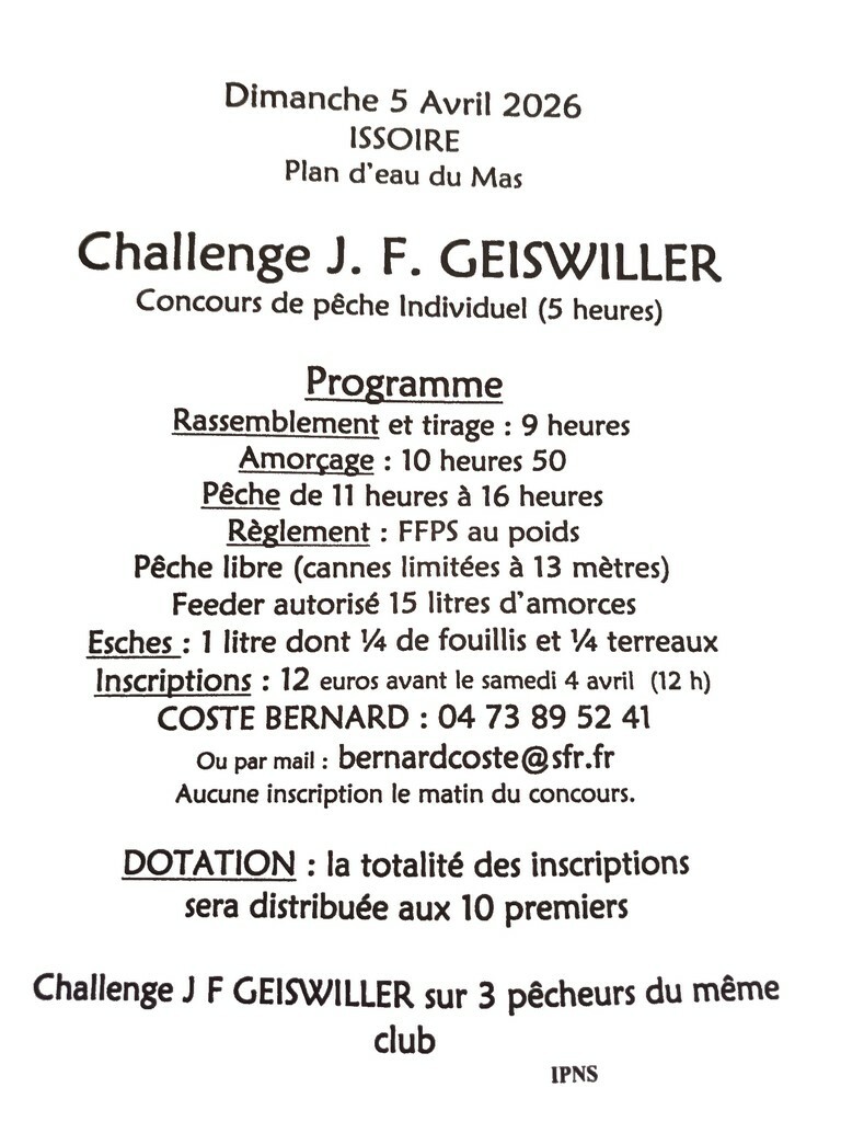 Challenge J. F. Geiswiller individuel organisé sur le plan d'eau du Mas (63). Concours open.