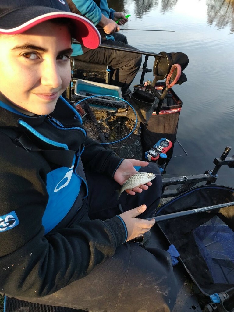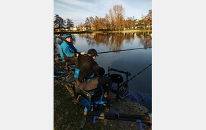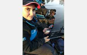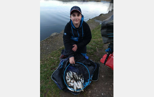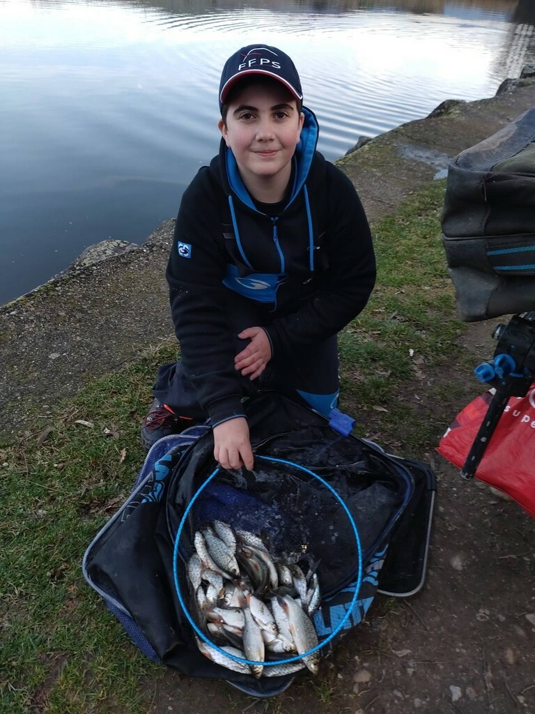 Une pêche difficile durant 2 heures où seulement 3/4 petits poissons, d'habitude ils rentrent après la pose de midi, mais là vraiment rien, alors changement de stratégie et passage à l'anglaise, cela tombe bien il y a Alain Grillet un spécialiste qui prendra le temps de conseiller Eliott, il arrivera à enchaîner les gardons pour un total de 54 prises et 2400pts.